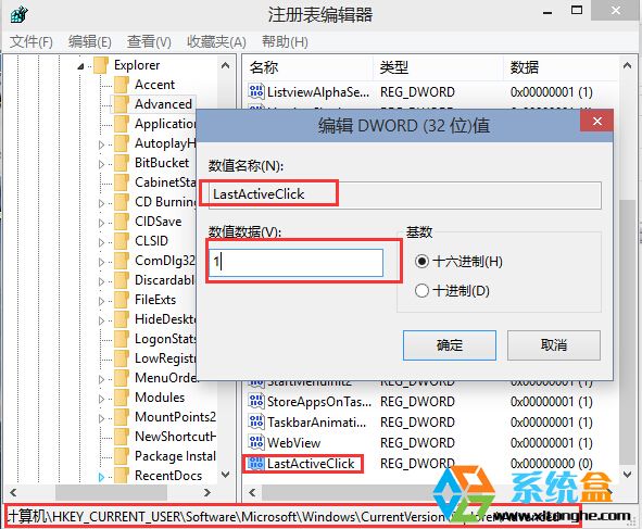 3、在右邊窗口新建DWORD(32位)值,命名為LastActiveClick,雙擊打開後,將數值數據改為“1”並確定;