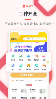 找幫工app是一款非常給力的掌上裝修應用。找幫工app旨在解決裝修行業痛點,在找幫工app中,業主可以免費找裝修工人,師傅免費接單,沒有中間商賺差價,給多少拿多少,非常便利,並且現有海量工人,業主入住,海量訂單,等你來接單哦!