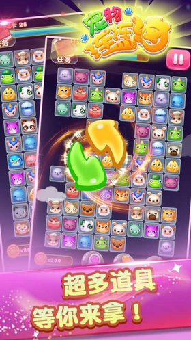 寵物連連消一款非常休閑的手機遊戲,這款遊戲以經典三消為基本玩法,有著可愛Q萌的角色,絢麗多彩的畫麵,輕快的消除音效,炫酷的消除效果,讓玩家耳目一新,喜歡就來下載吧。