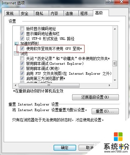 2在新彈出的對話框中,選擇“高級”選項卡 -- “設置” -- 在下拉列表中找到“使用軟件而不使用GPU呈現”,並在其前方打上對號。