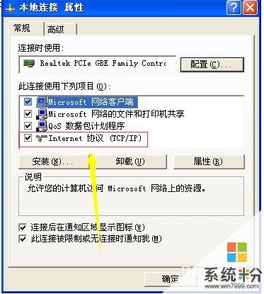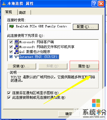 4彈出本地連接屬性對話框,在”常規“下移動鼠標點擊選擇”Internet協議“,選擇好後,點擊紅色方框圈出的”屬性“