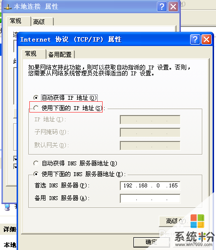 5彈出Internet協議屬性對話框,運用鼠標把”自動獲得IP地址“改為”使用下麵的IP地址“,然後輸入IP地址,完善各項信息,點擊確定即可