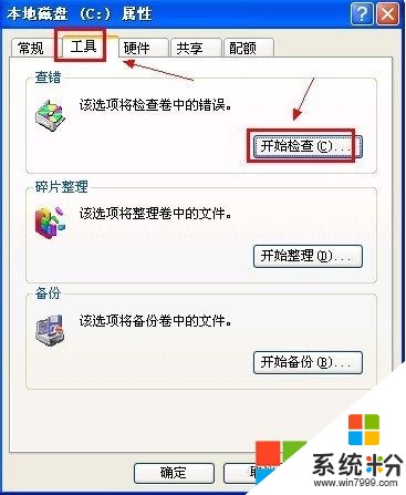 彈出“本地磁盤的屬性”窗口,切換到“工具”選項卡,單擊“查錯”欄下的“開始檢查”按鈕