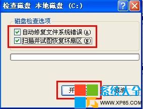 在“檢查磁盤”對話框的“磁盤檢查選項”下勾選“自動修複文件係統錯誤”和“掃描並試圖恢複壞扇區”的複選框,然後單擊“開始”按鈕