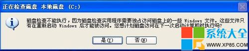 如果你要檢查的磁盤為係統分區,則會彈出以下提示框,單擊“是”,重新啟動計算機即會運行Chkdsk