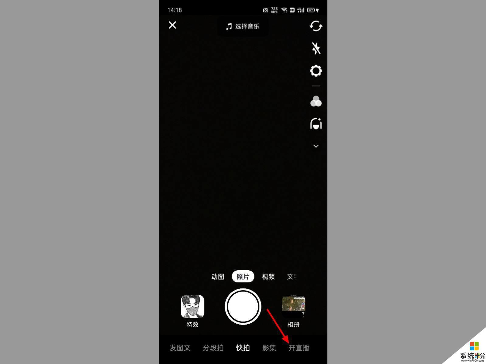2.進入作品拍攝頁麵後,點擊右下方的【開直播】選項。